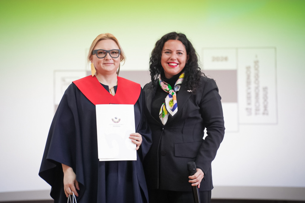 Lietuvos Respublikos Seimo narė, KTU PTVF absolventė Modesta Petrauskaitė, dalindamasi asmenine patirtimi, skatino absolventus drąsiai žengti pirmyn:
